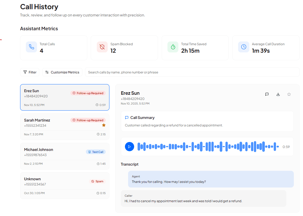 Review call recordings, transcripts, and lead history in your dashboard. See exactly what was said and never lose track of a potential customer.